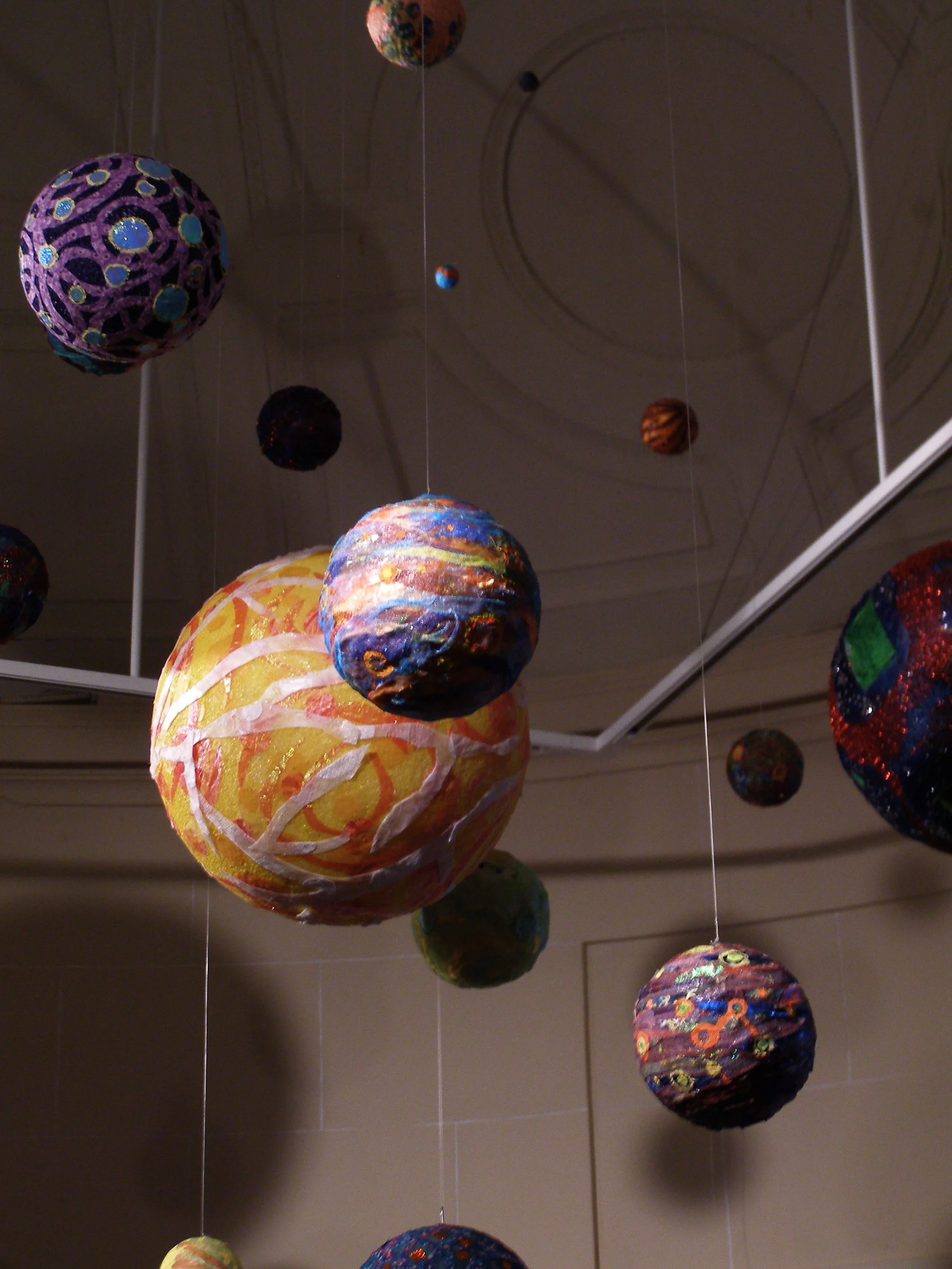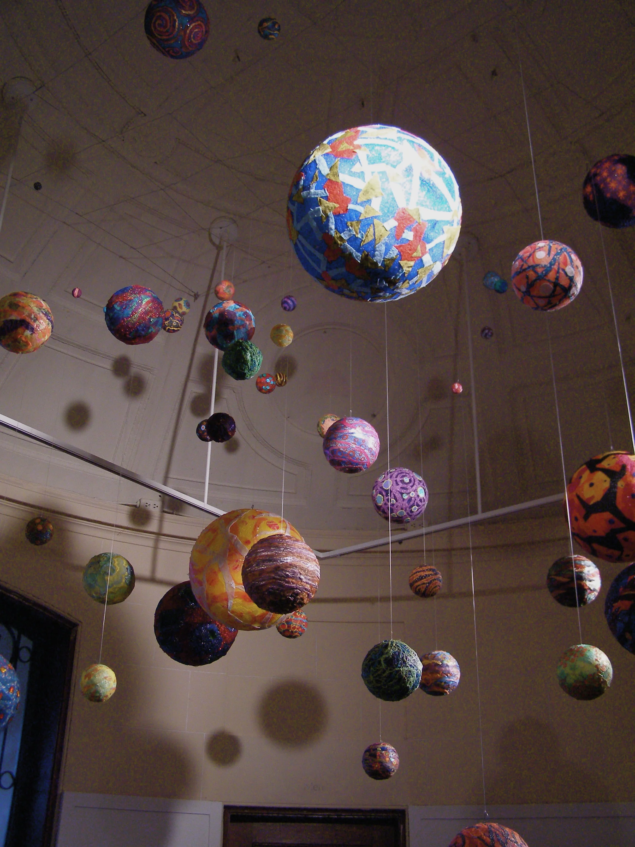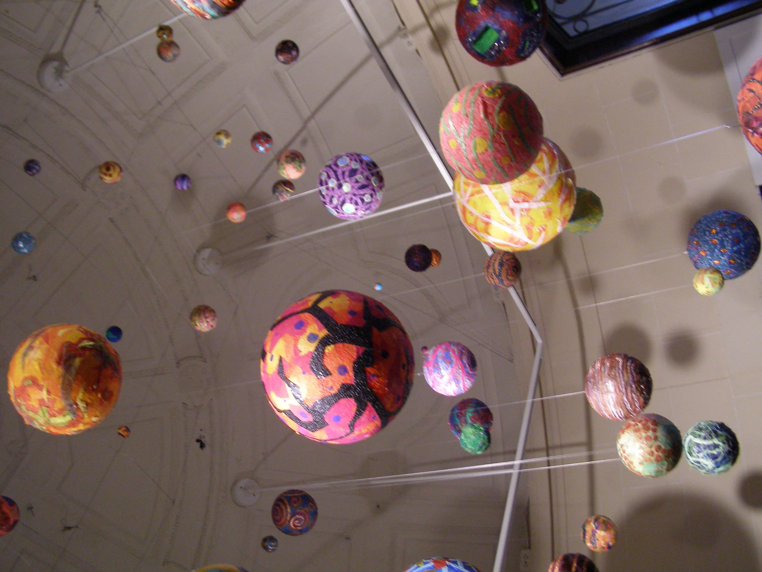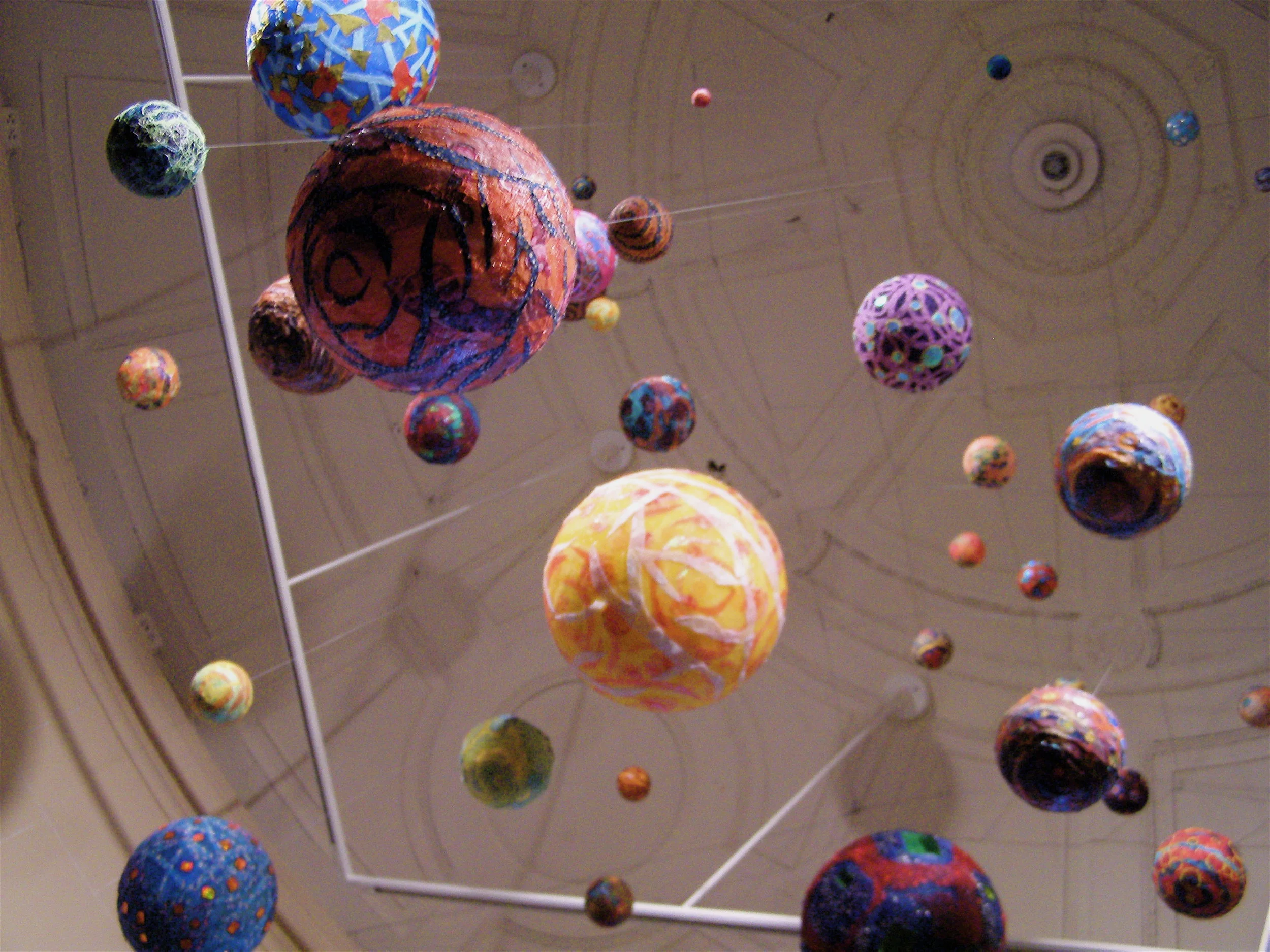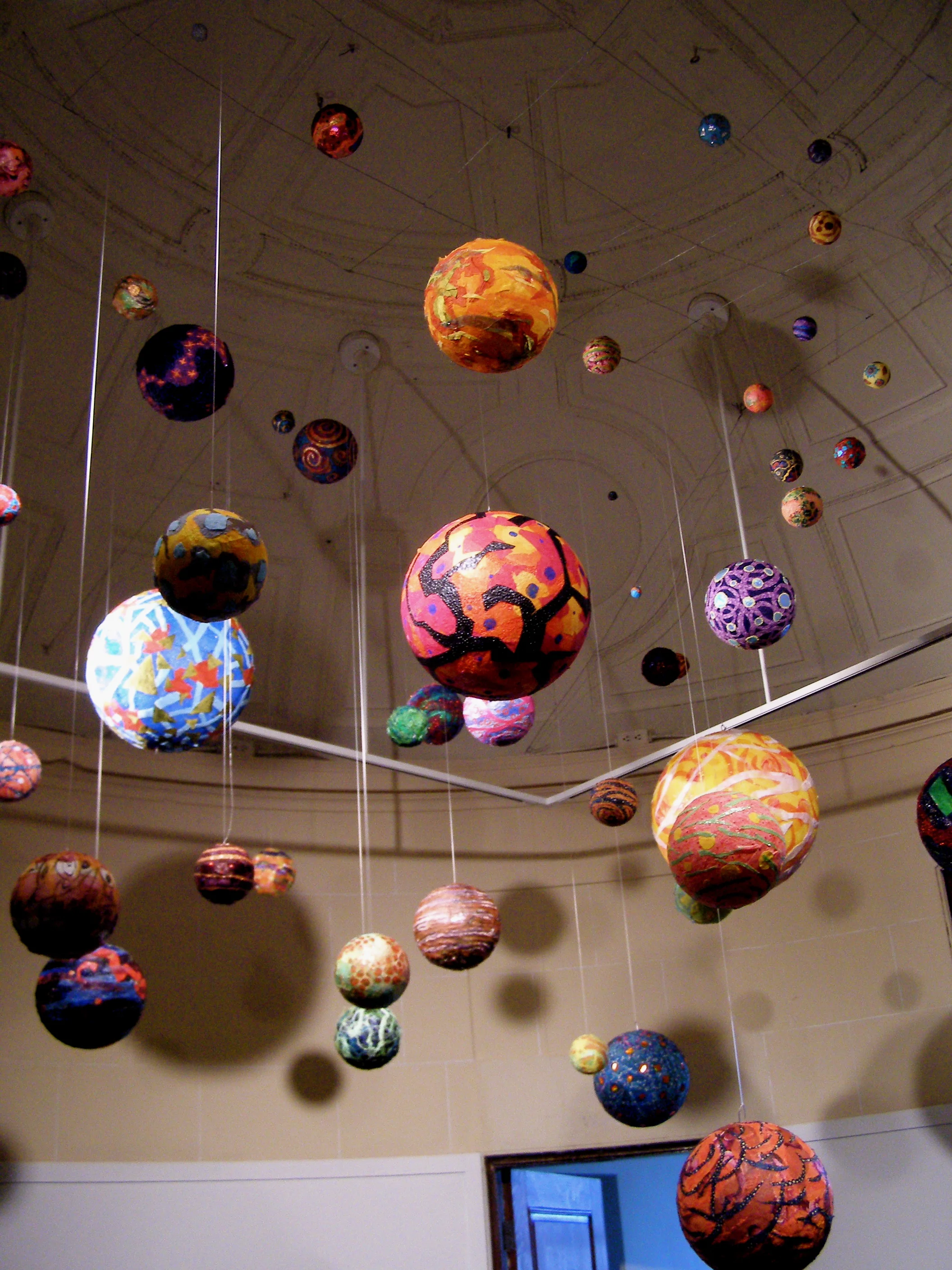 64 decorated styrofoam globes suspended from a 15 foot dome. Ranging in size from 1 inch to 1 foot in diameter, the globes are meant to evoke the wonder and space of the cosmos.