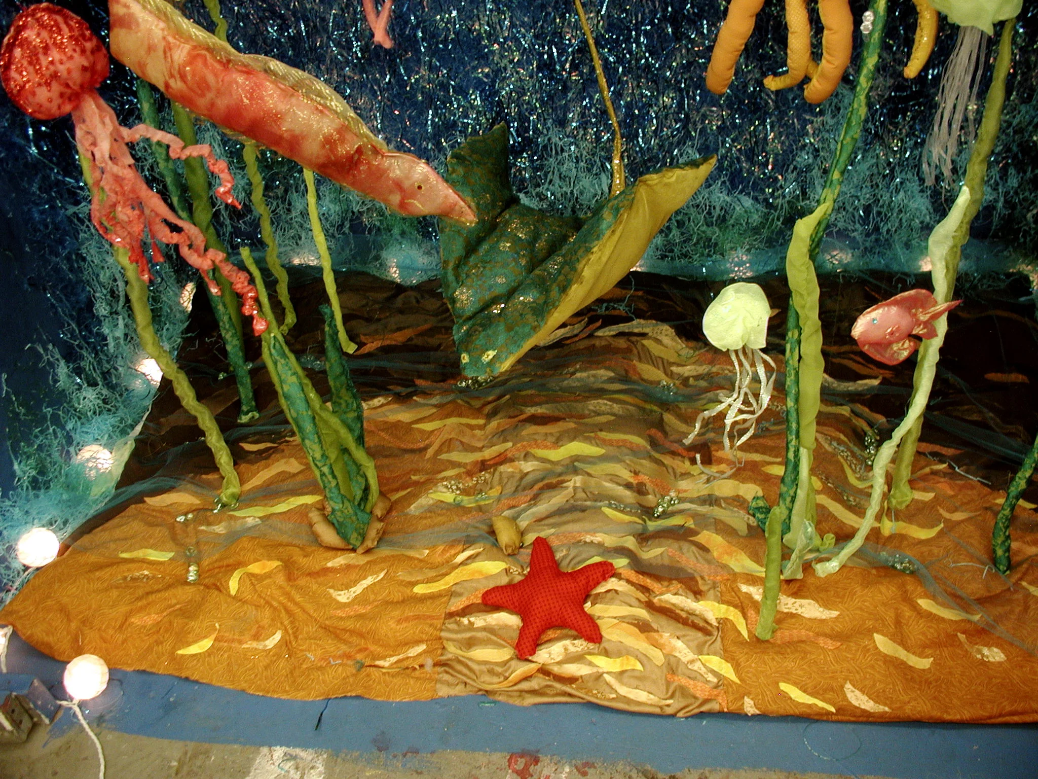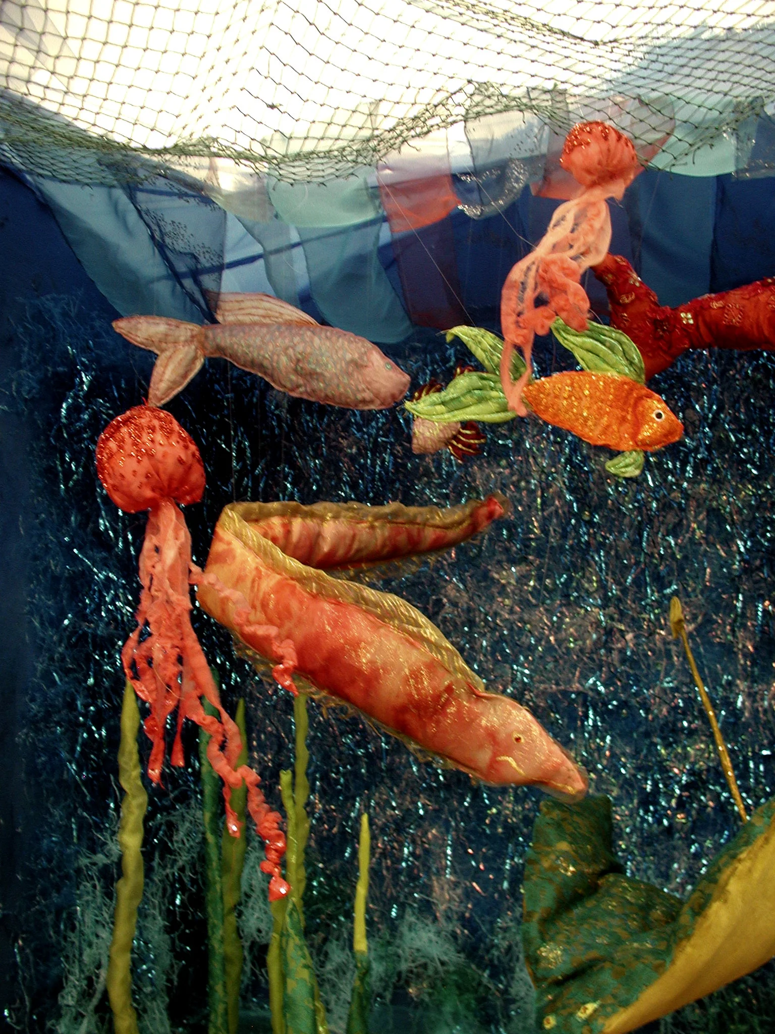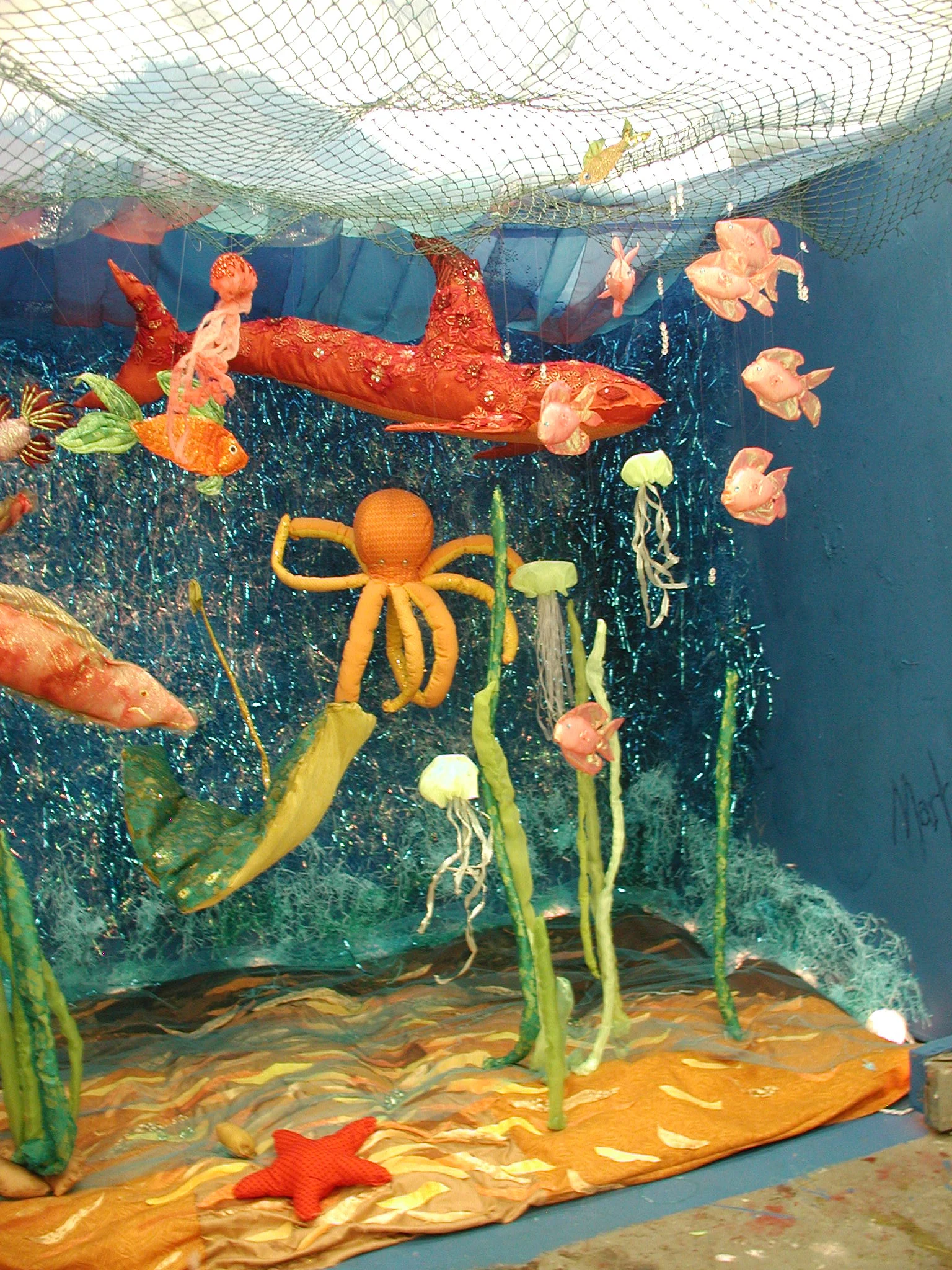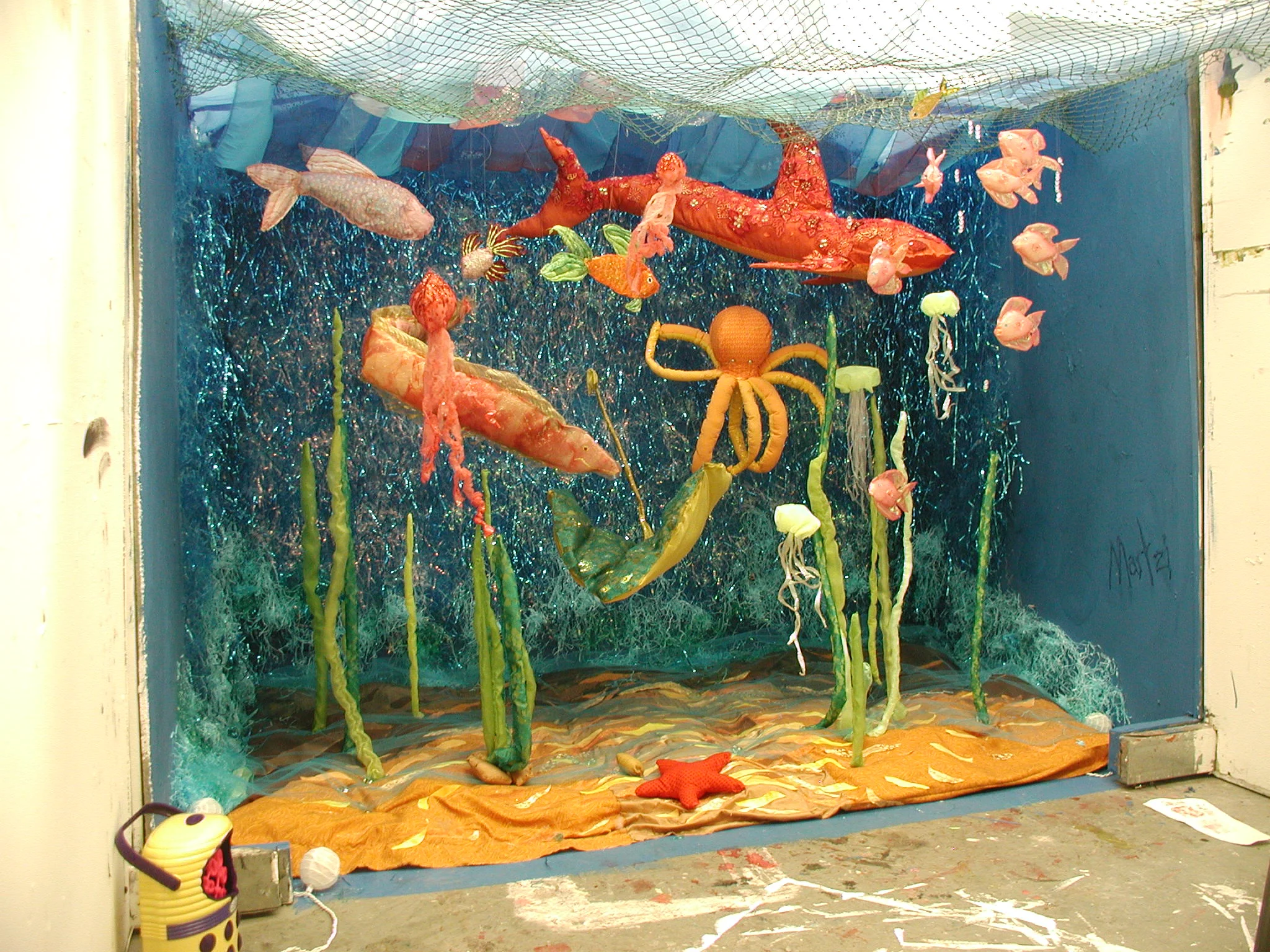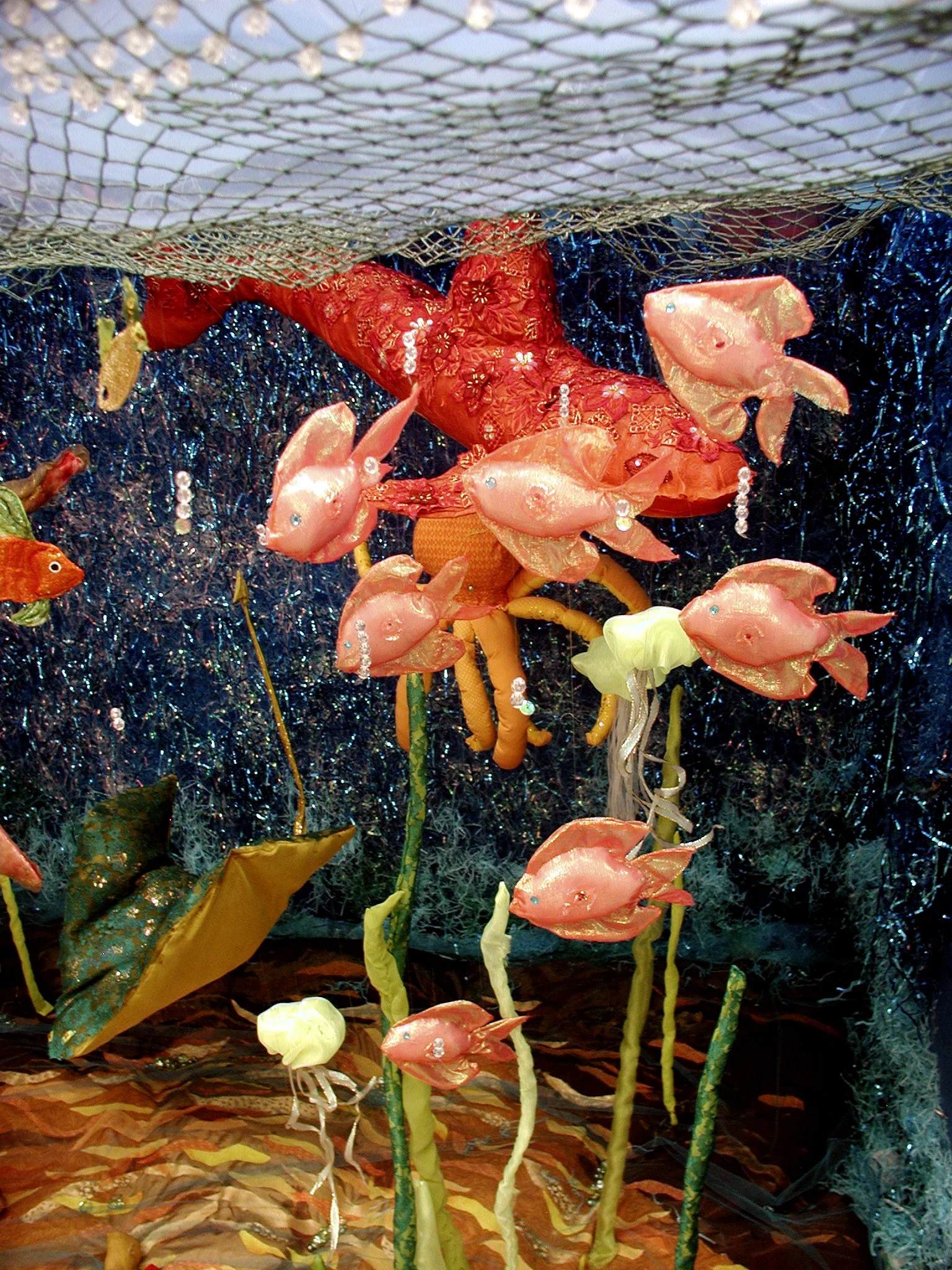 64 decorated styrofoam globes suspended from a 15 foot dome. Ranging in size from 1 inch to 1 foot in diameter, the globes are meant to evoke the wonder and space of the cosmos.