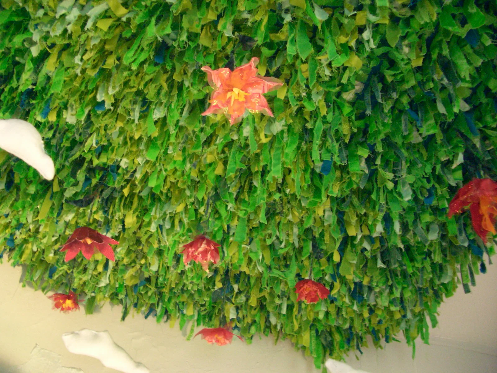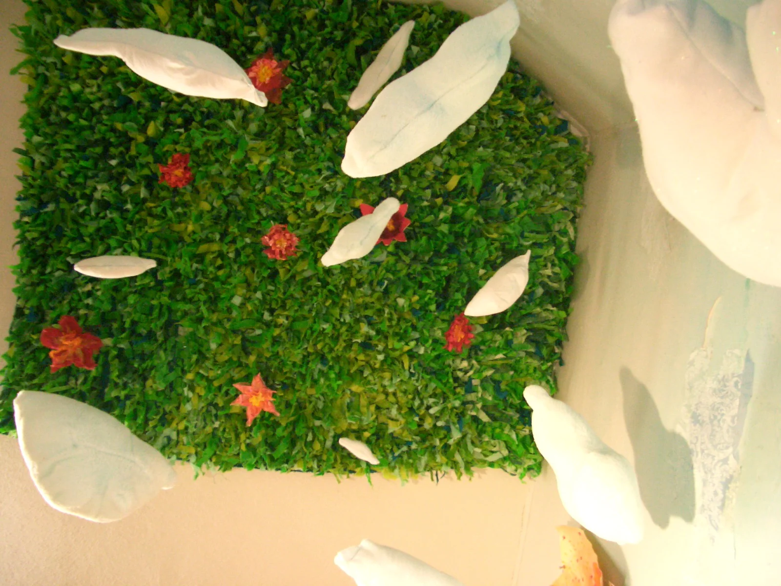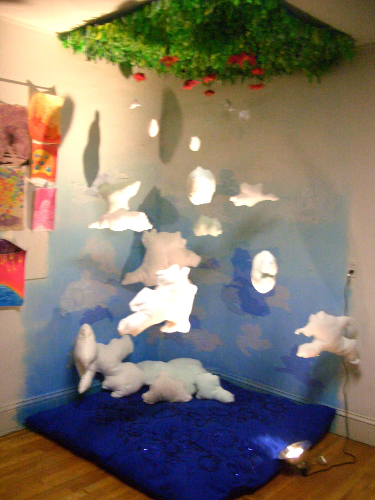 Immersive experiance where the viewer lays down on a large deep blue cushion and looks up to see clouds floating above them and past that a flowering field of grass on the ceiling.